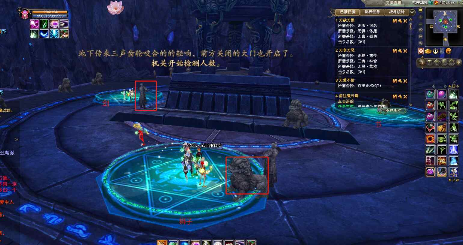 俗称“数狮子”,房间地上有三个圆圈,分别是:狮子,书,剑,周围一圈石俑,10个人都抵达房间后,可以一个人随便站进一个圈再出来,触发法阵运转,周围的石俑开始移动,观察移动攻击人物的石俑,分别各是几个,然后对应站进圈里,打掉所有攻击的石俑即可。如人数错误,地上会亮红圈,激活相差数量的石俑再次攻击玩家,此时调整人数站位,再打掉石俑。如人数正确,亮绿色光圈,游戏完成。