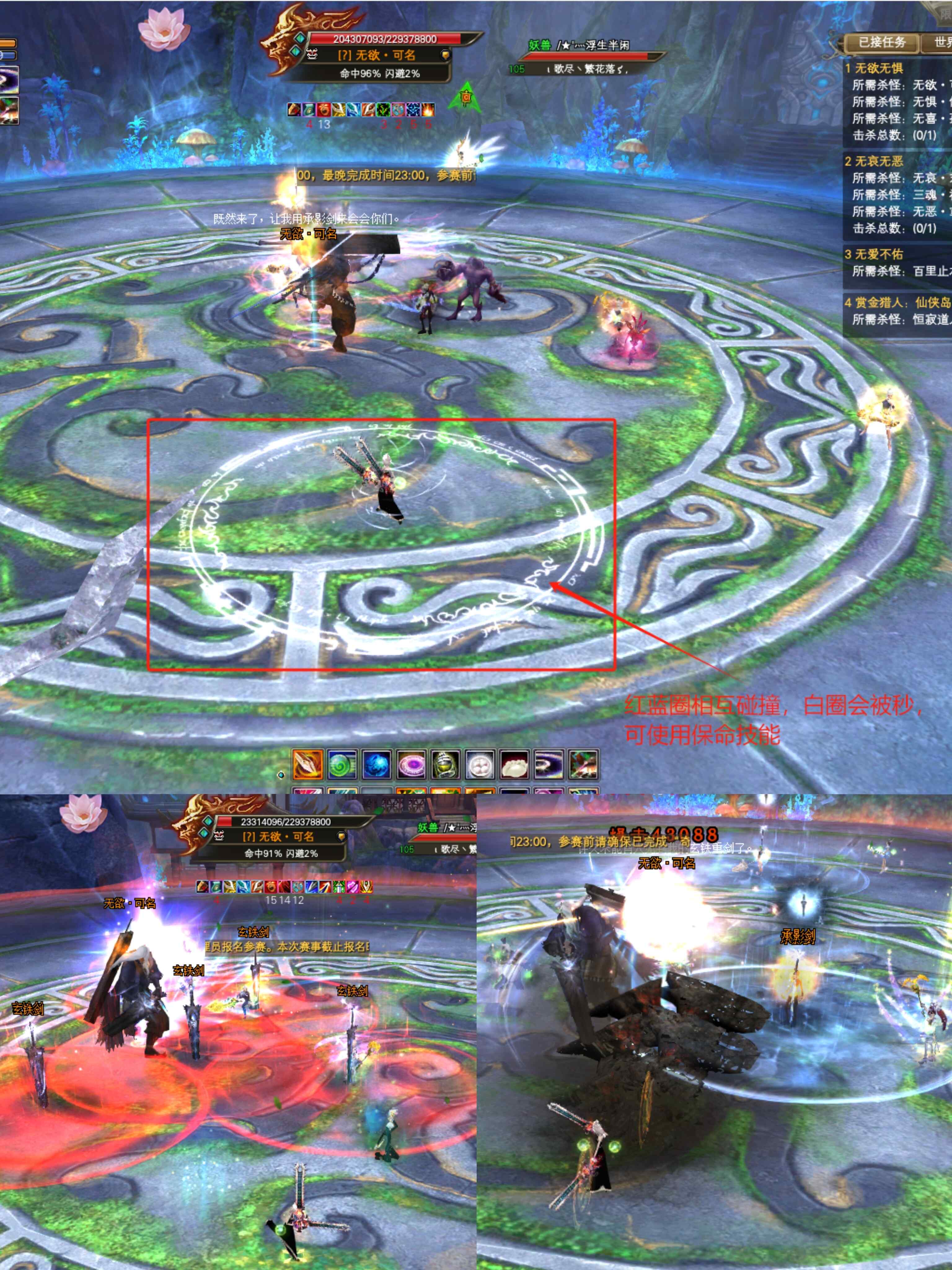 地面上出现的蓝色承影剑光圈,和红色玄铁剑光圈,都需要躲开哦!光圈都会给玩家造成大量伤害,还有一种追魂剑,随机对一位玩家追魂夺魄,触碰到追魂剑的玩家,都会被秒杀。