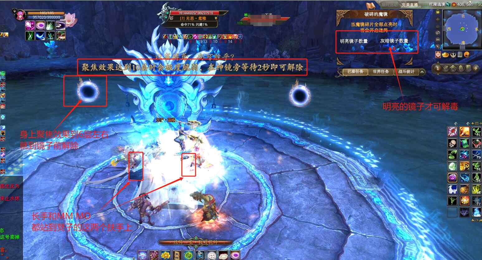 俗称:“镜子”,第二关里面比较难的一个BB啦!因为BB通过镜子,会反弹一部分自己受到的伤害!所以这也是玩家特别容易挂掉的一个BB,如果攻击不够,死去活来是常事!手长的打手,还有羽灵、魅灵,都跳到BOSS坐的凳子扶手上!(实测这里受到的聚焦层数会变少!)MM直接开蓝阵(极度乾坤),开怪后,BOSS会召唤魔镜碎片,将光聚焦到没有跳上扶手的玩家!聚焦层数越高,受到的伤害加深程度越高!聚焦达到10层时,玩家会立刻死亡!因此当我们身上的层数显示6-7层时,要赶快前往BB身后亮起的神镜处,紧靠神镜停留2秒左右即可解除聚焦层数。