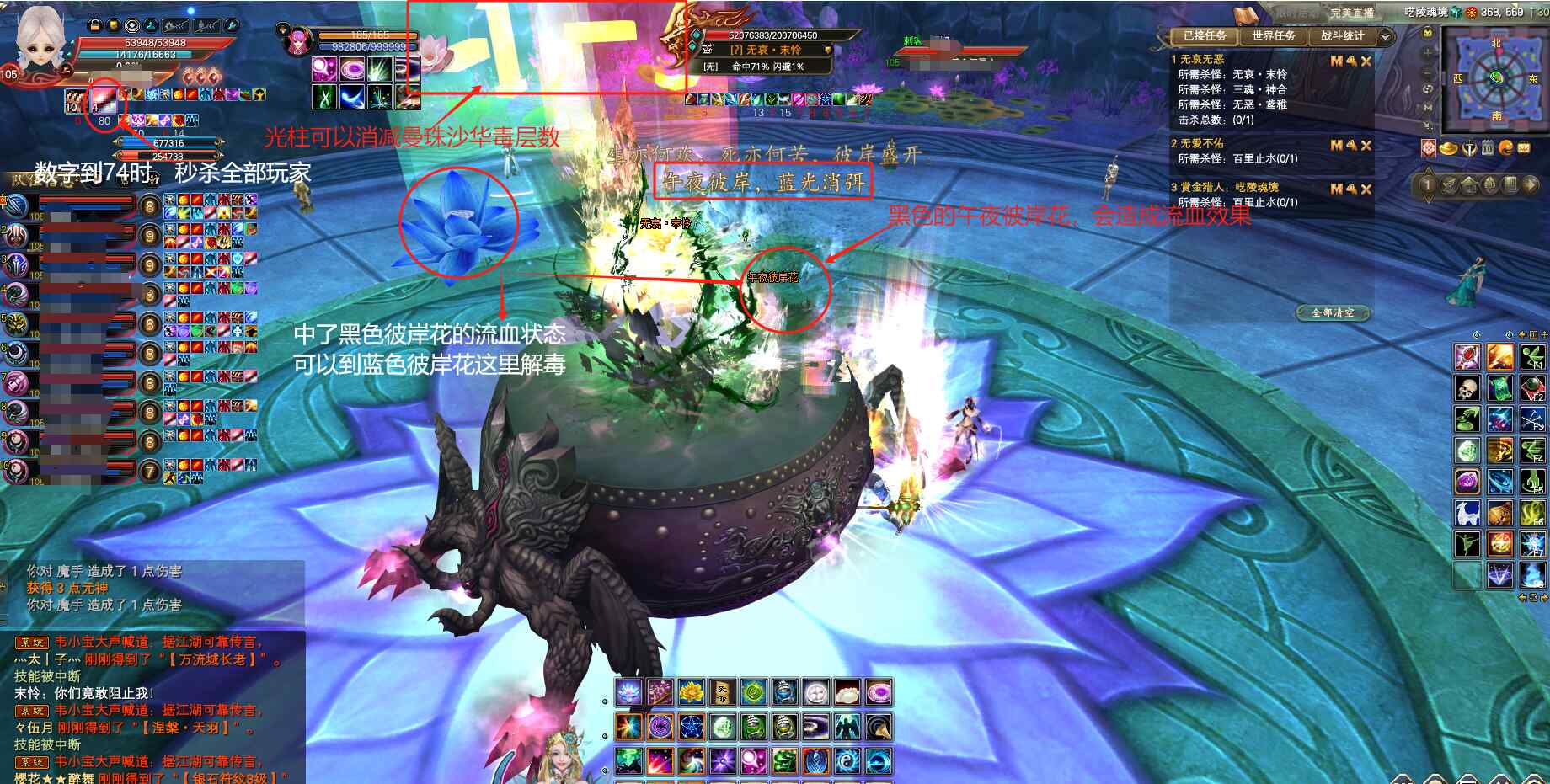 当屏幕上出字“生亦何欢,死亦何苦,彼岸盛开”,BOSS会随机选择一名玩家,中黑色的午夜彼岸花之毒,身上有持续流血状态,等屏幕上出字“午夜彼岸,蓝光消弭”,地上出现蓝色的花,中毒流血的玩家前往蓝花处停留解毒。屏幕出字“血色彼岸,白绫染血”,满屏出现红花,全队中毒,失去攻击力,等地面上出现白花时,赶紧去白花处停留解降低攻击力的毒!再回到BB脚下打怪!此时MM可以开红阵,大家可以爆元提高输出!(注意:白花和蓝花都是出现30秒,30秒后消失,记得赶紧去解毒!)