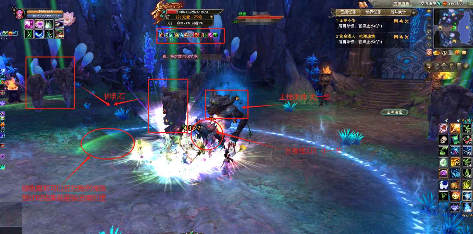 3次箭头冲锋之后,出8秒倒计时黯然魂殇,屏幕上有红色光圈不停闪烁,需要去钟乳石后面的绿色扇形里面躲避伤害。中间开阵的MM和没来得及躲避的玩家,可以在倒计时1秒的时候,用精灵技能“信念”哦!可以免疫所有不利状态!这里“绝对”是没有用的,一定要用信念!