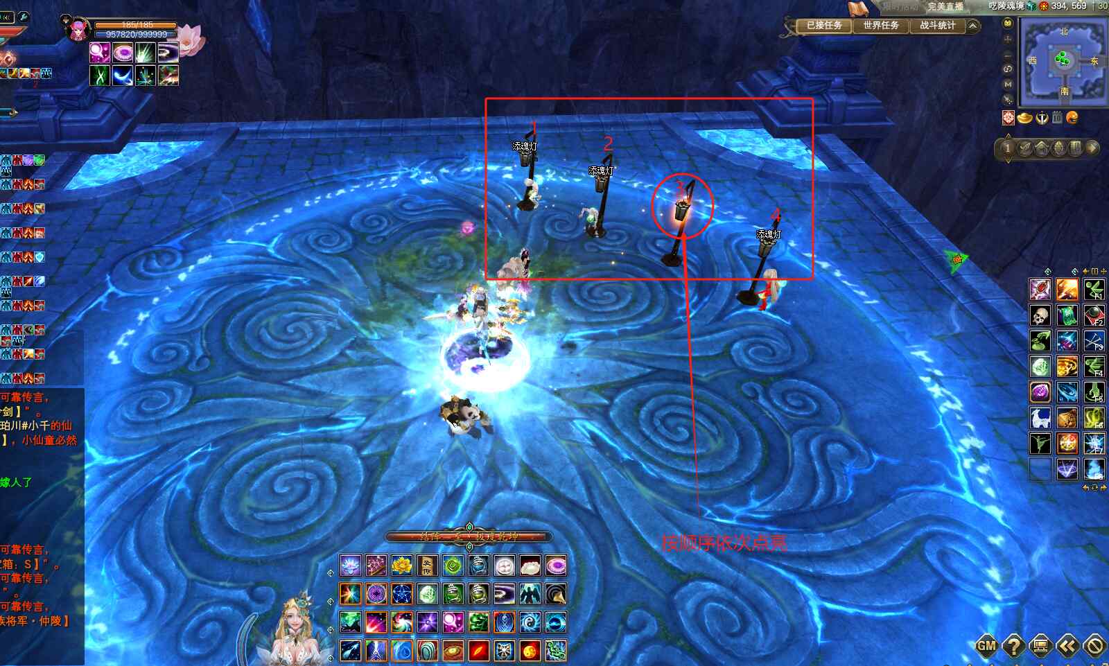俗称“挖灯”,房间台子上有4盏添魂灯,按照正确的顺序点亮,即可开启前方的道路,如果开启顺序错误,就会出现战死行尸攻击玩家。这里羽灵需要开启蓝阵,安排4个人同时挖灯,会看到哪一个是亮起来的,如图亮的是3号灯,出怪就打死群掉。第二次就先挖3号灯,在安排3个人,同时挖剩余的3盏灯,如果亮起的是2号灯,第三次就先挖3再挖2,在安排2个人同时挖剩余的2盏灯,如果亮起的是1号灯,那挖取顺序就是3214。用这个方法就能得出全部的挖取顺序了!
