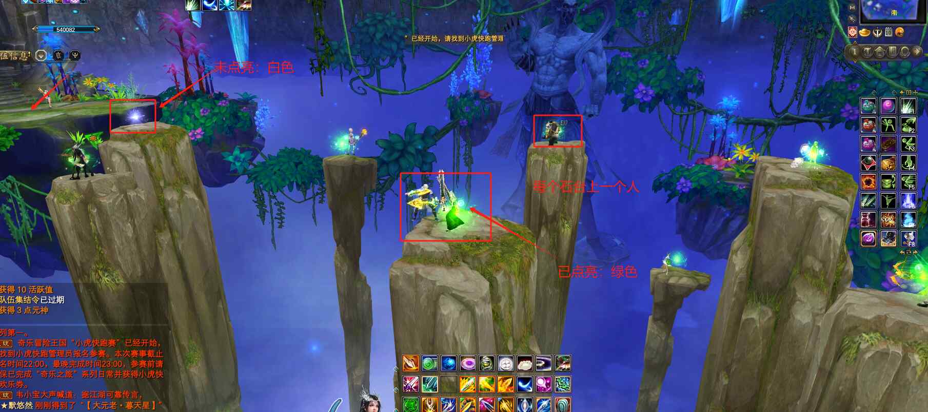 俗称“跳柱子”,房间中间会依次出现8根高矮不一的石柱,每根石柱上面有白色的光球,点亮一根石柱的光球后,才会出现下一根石柱,等中间8根石柱的光球都点亮变成绿色后,房间对面的小石堆处,会出现白色光球,点亮这个光球,游戏完成,所有人都会被传送到对面的小石堆处。跳柱子的秘诀在于加速和连跳,加速可以使用精灵技能:神行真言,或者职业自带的加速技能,连跳则是快速双击空格键。不会跳的小可爱,也可以用职业自带位移技能前往别人跳到了的柱子哦,比如剑灵的御心剑,妖兽的怒扑,武侠的至冲锋,刺客的如影随形。如果中途有人点亮柱子后掉下去了,那全员返回起点重新开始,所以一定要保证每个点亮的柱子上都有人哦!