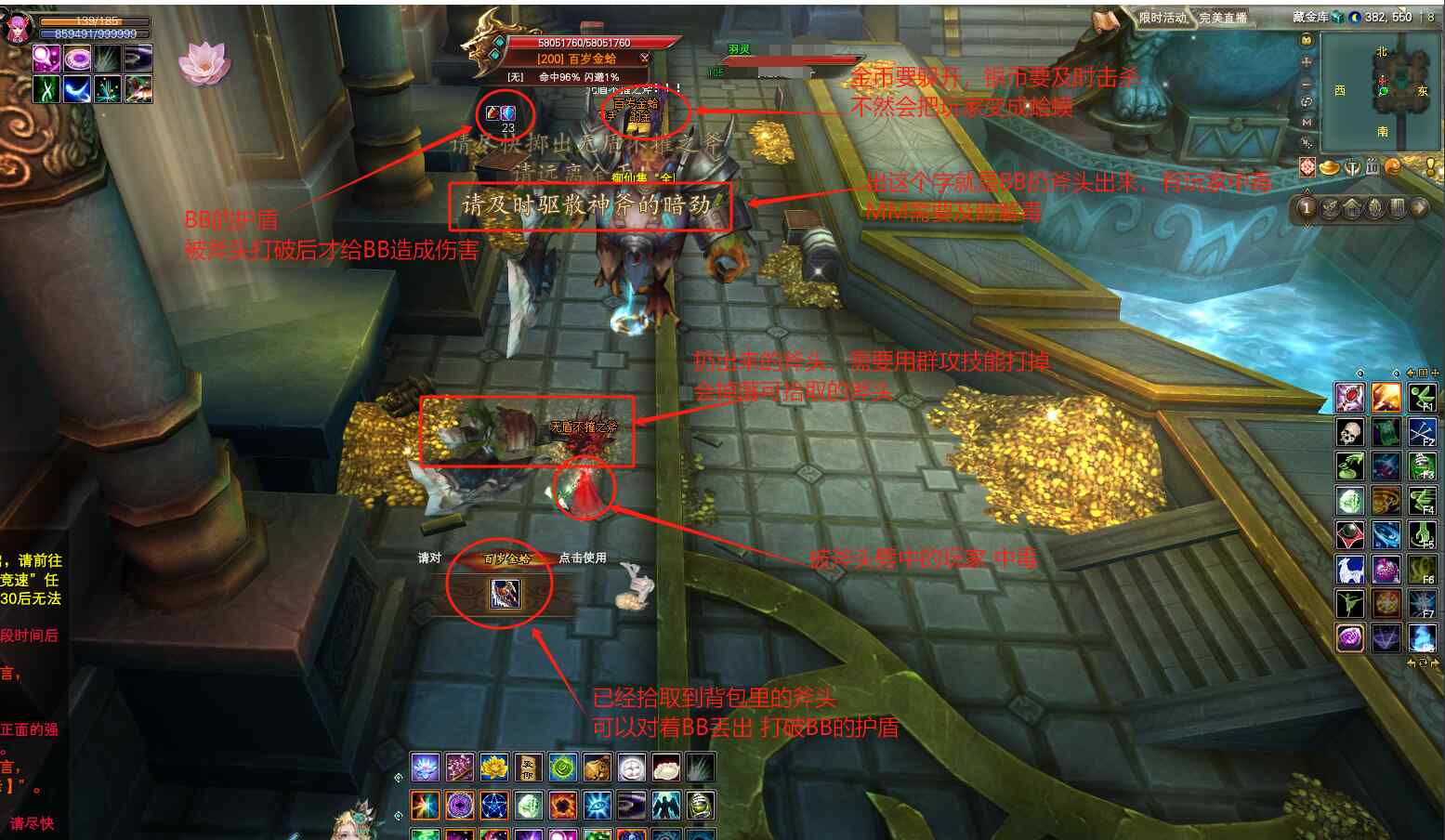 BB会随机向任意玩家丢出“无盾不催之斧”,同时屏幕上出字“请及时驱散神斧的暗劲”,被斧头劈中的玩家会中毒,可以爆元解除中毒状态,也可以等MM给玩家解毒! 这个时候WX或者JO使用群攻技能,攻击BB丢出来的“无盾不催之斧”,击杀后,会掉落出来一把可以拾取到背包里的“无盾不催之斧”,选中BB,会看到如图所示的斧头图标,可以鼠标左键点击对BB使用斧头,就能破开BB身上的保护盾,对BB造成伤害了!普通队伍,建议先囤2-3把斧头在包里,然后在对着BB使用,避免中途捡不到斧头,BOSS回血!