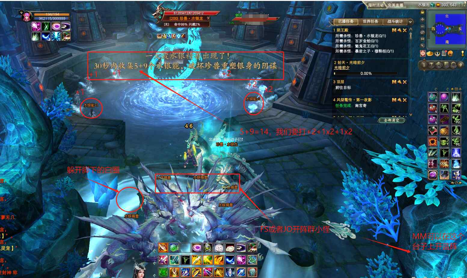 水银龙这关很多人说不会正常打,其实很简单的,安排一个机灵点的会算数的的远程打手,羽芒最好,琴剑法师也可以,去打数字。开怪后,水银龙会说话:“30秒内收集 ?+?个水银能,破坏珍兽重塑银身的阴谋”,水池周边分布了8个小怪,身上对应不同的数字,有+1,+2,x2三种。如图水银龙说的5+9=14,那我们就需要打+2+1x2+1x2=14,来阻止水银龙回血。如果打错了数字,或者30秒内没有打到符合要求的数字,那水银龙重塑银身,瞬间回满血!(当然,如果队伍输出能在30秒之内杀掉水银龙,就不用打数字了,直接集火输出!)