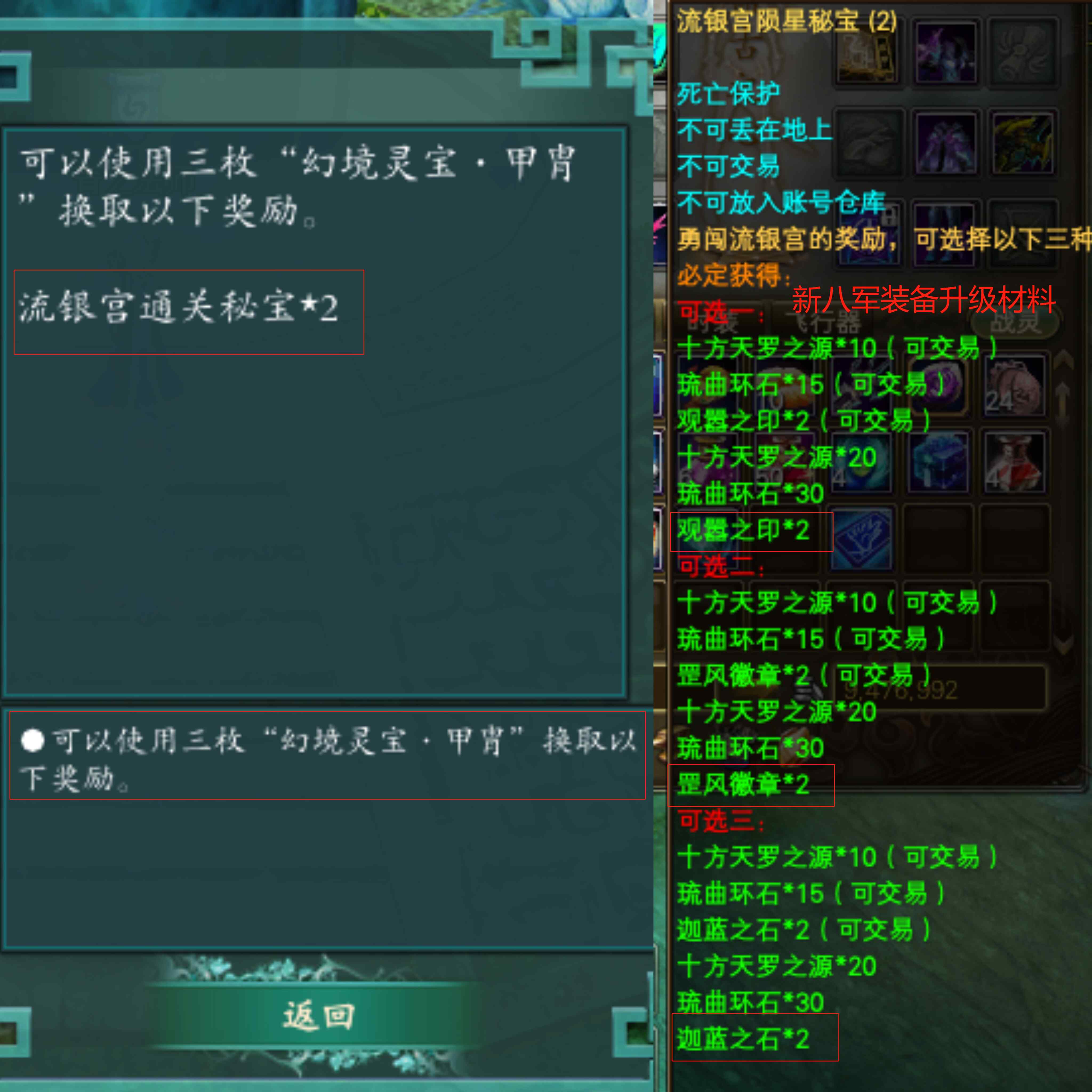 最后击杀掉疯太子妃·良姬,完成流银宫挑战任务,可以用3个幻境灵宝·甲胄兑换2个流银宫陨星秘宝。宝箱包含升级新八军装备的材料哦!