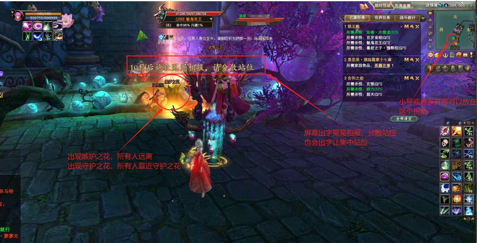 前往迷情境的通道里面和BOSS面前都有小怪,等打手清掉后,脆皮小号再过去,多开或者很脆的号,可以放在如图所示的通道拐角处。花王机制很简单,主要就是集中和散开,屏幕出字“10秒后施放冤冤相报,请分散站位”大家分散开站位,间隔5米以上哦!如果出字“10秒后施放同甘共苦,请集中站位”,则大家集中在一起站位,尽量靠近拉仇恨的玩家集中。期间地上还会出现金色的“嫉妒之花”不管是集中还是分散,都要远离嫉妒之花,靠近嫉妒之花的玩家会被秒杀。如果出现银色的“守护之花”,那大家就要靠近守护之花。边走机制边输出,击杀掉花王,就可以通往下一关了!