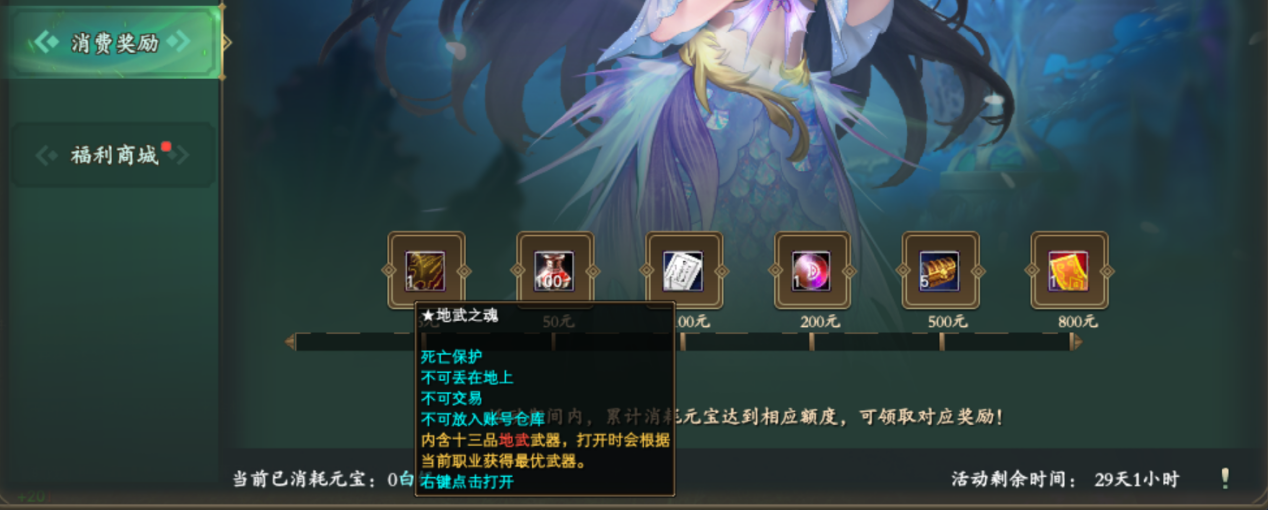 在新手活动期间,累计消耗6元宝即可在【英雄之路】消费奖励中领取新手强力武器“地武之魂”,这把武器直至角色2转100级之前都无需更换。