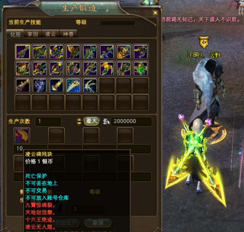 获取方式:前往祖龙城西找到NPC不明人 云野(522,657),对话选择“凌云奇珍”打开生产界面,选择本职业武器,使用10个“凌云碑残诀”及200W游戏币进行兑换。