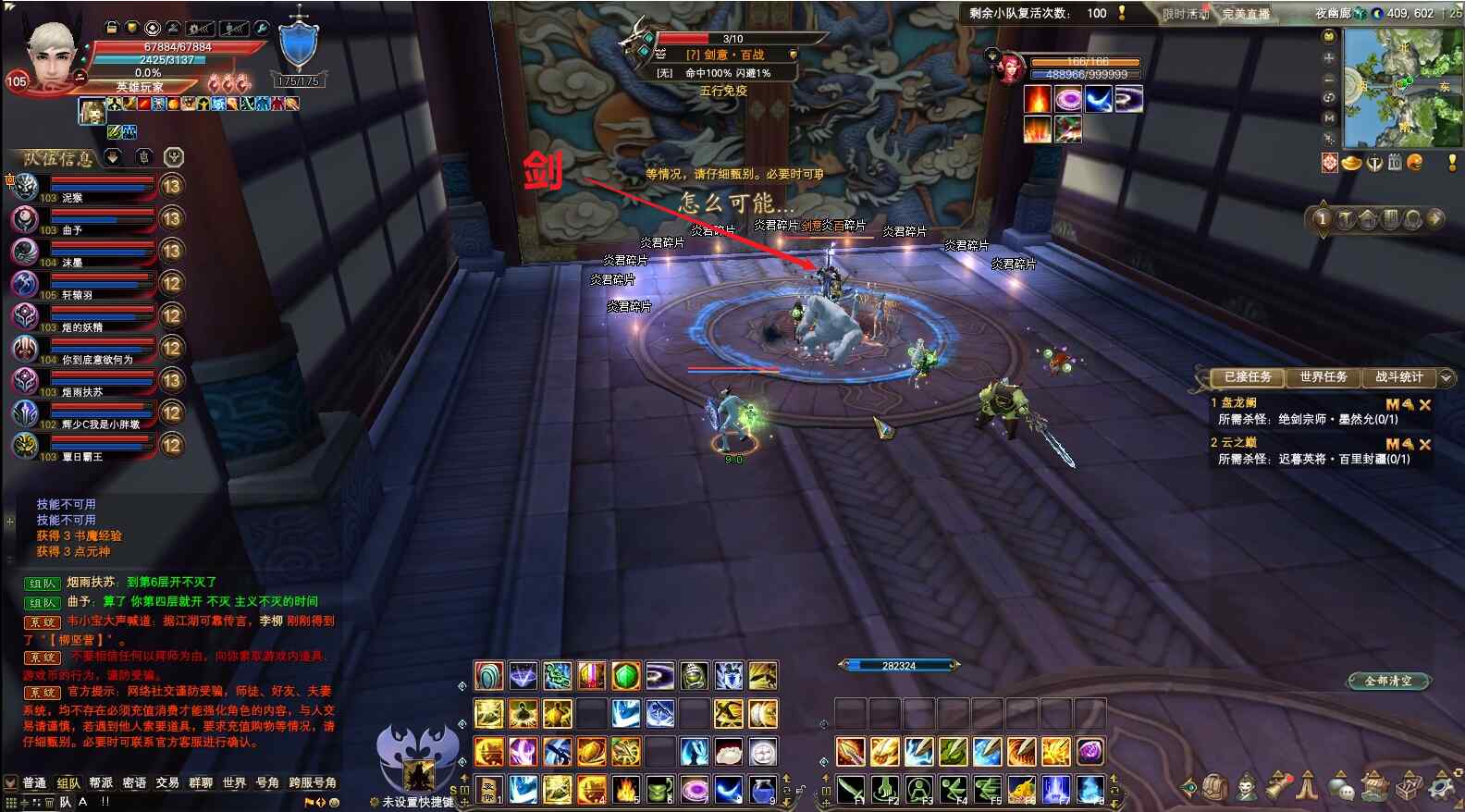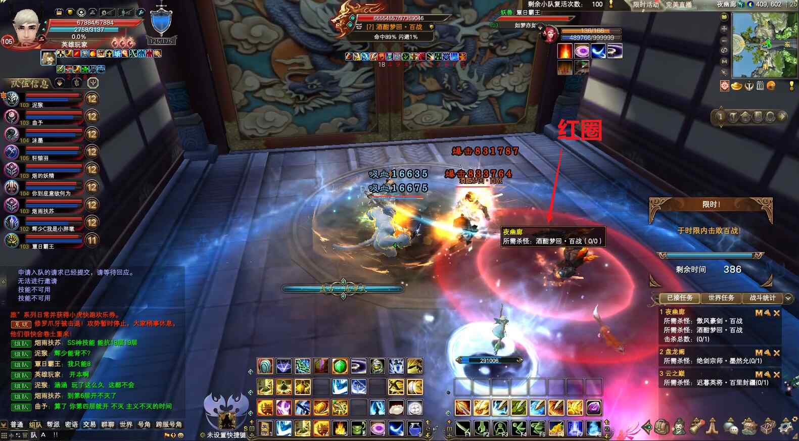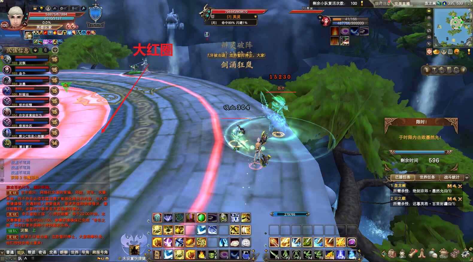 开怪正常打,不用爆元。等出圈后,负面选手给boss上状态(剑灵上剑印和破斧,武侠看到破斧后放龙),打手爆元,集中最大输出打。出第二波圈后,移动到圈外边缘,负面给boss上状态,打手爆元,集中最大输出打。快的话,两三波圈就能杀死boss通关。