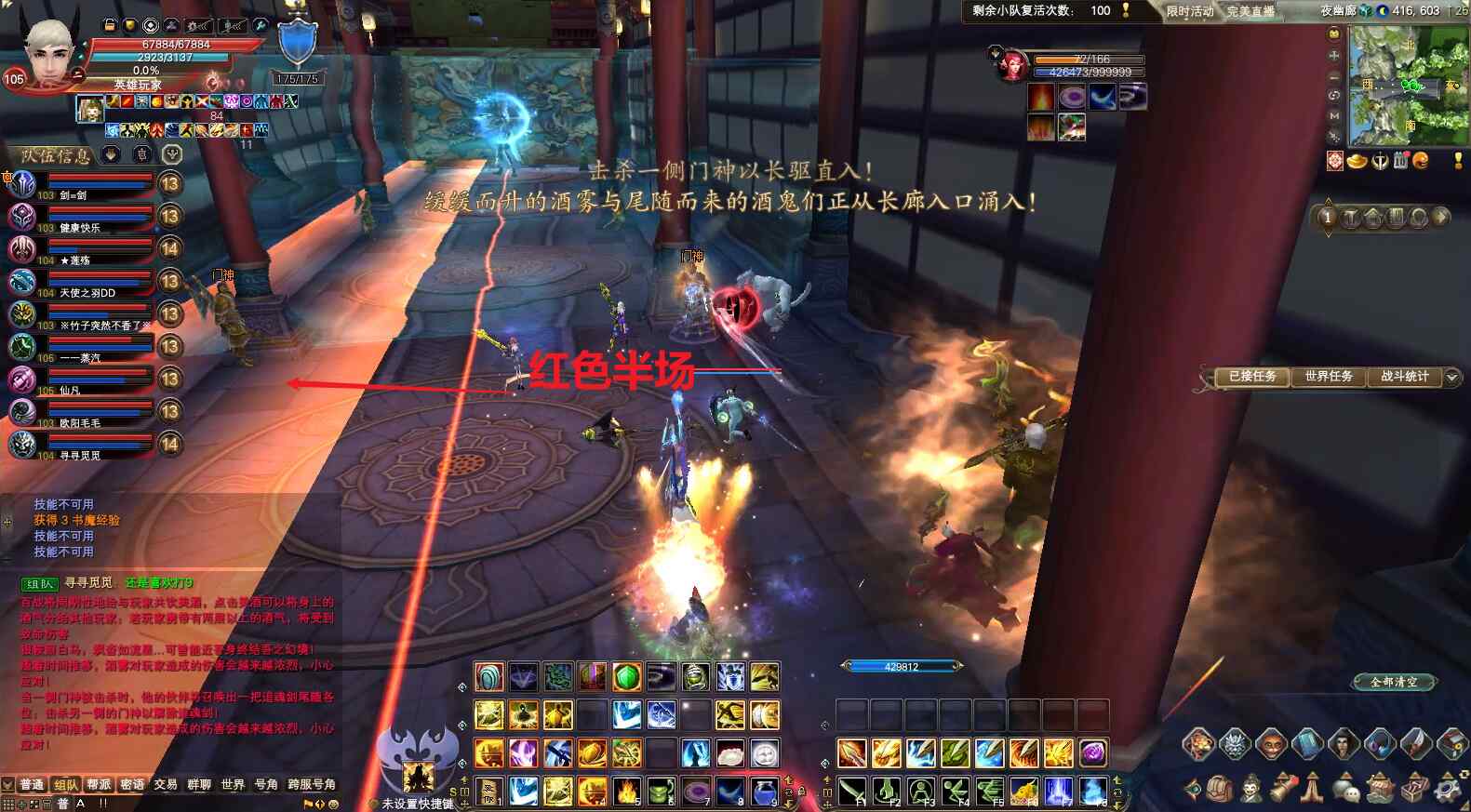 6)玻璃墙机制。boss每次到一定的血量会清除所有状态并无敌,然后出现玻璃墙机制,并把所有玩家传到第一个玻璃墙前,同时有几个小怪会一直跟着玩家,特别要注意,头上有红圈的玩家,不要被透明圈圈追到,如果被追到,会导致团灭。