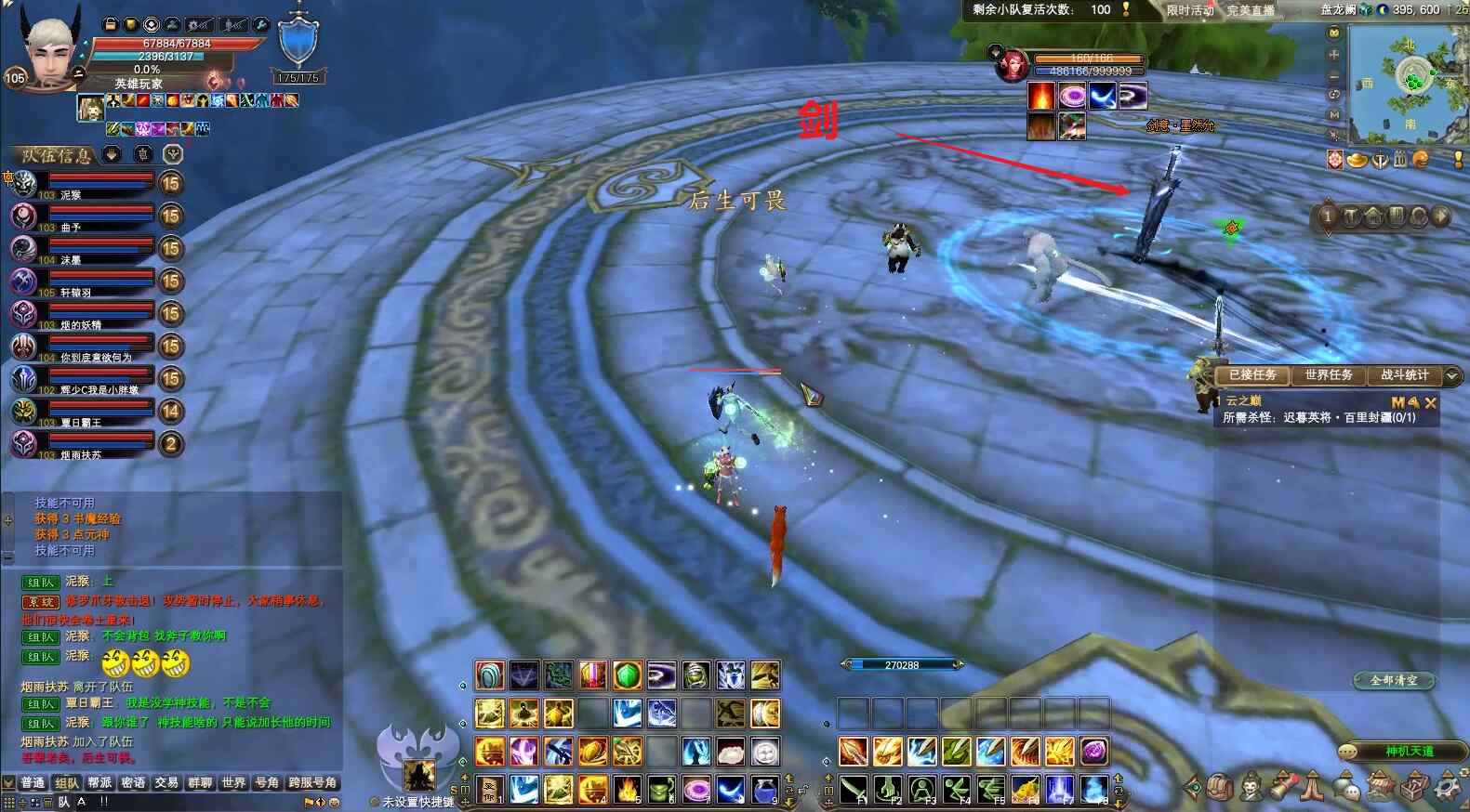 3)boss每到一定血量会无敌,同时场上四周会出现多个“英灵”,击杀所有“英灵”后,才能继续有效攻击boss;经过实战发现,攻击同职业的英灵伤害最高。