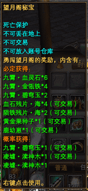 如图所示,上面是望月阁通关后的奖励秘宝。右键打开。打开前需要包裹中至少有10个空格子。