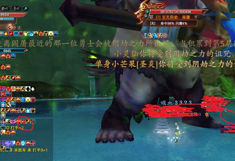 注意,这个怪,有夜影状态,所以8米外攻击几乎没有伤害,如图我红圈标示的深绿色圈圈。