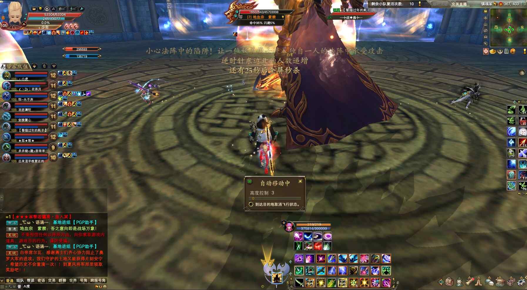 地血宗.紫禁,善于控制阴阳平衡之力与时针运转方向之间的奥义,使其生成的法阵如限时没破解可秒杀一切生灵,副本叫镇魂冢。10人组队“帮派悬赏使.赵寰宇”领票“地血宗传送门”进本,需大家靠近站一起由队长开本成功后BOSS才会出现。组队建议羽灵/魅灵、剑灵、武侠必备,装备要求28套、主力打手217武器以上、队员血量必须过万,进入副本后大家统一把右上角小地图雷达调整正方形并“+”最大,队长排数字1+22+333+4444,四组小分队。羽灵蓝阵,负面开打,BOSS到一定血量全屏提示“逆时针/顺时针某个方向开始人数递增”,按分组分别去对应防护罩,共计跑两轮破解法阵,后面固定位置出小怪快速击杀,最后集火打掉BOSS。战斗结束,打柱子后一起出本记得都交任务,闯关次数+1。