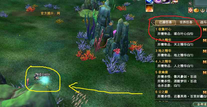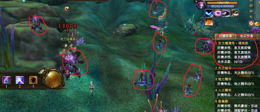如下图红圈标记怪物和任务。