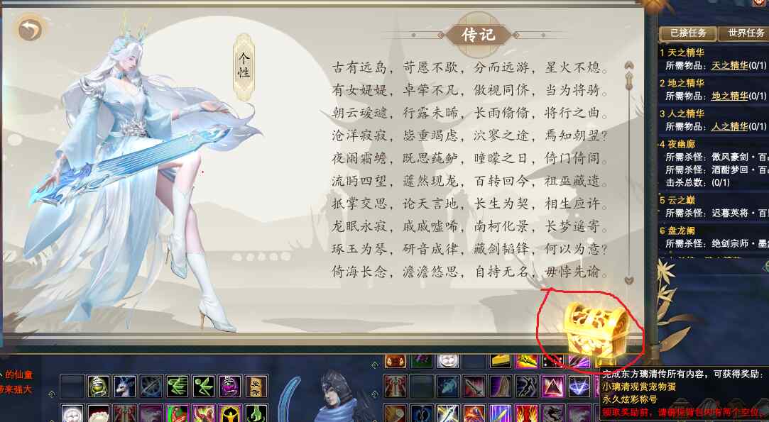 点击宝箱,就可以获得琴剑观赏宠和称号。自此,琴剑英雄志全部完成。