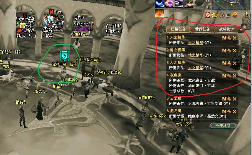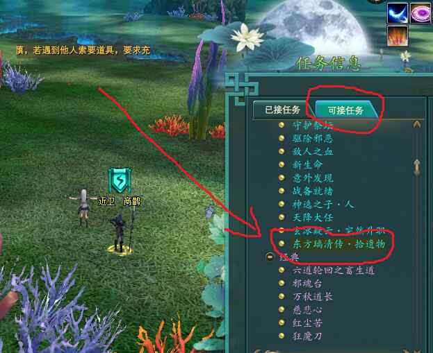 此时就需要观察周围有没有NPC可以接任务,有,就可以继续接任务做下去。如下图绿圈所示。