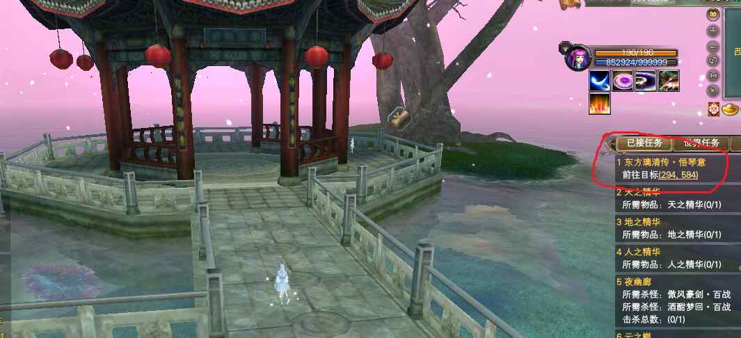 也是按照任务列表提示做下去即可。第四阶段的最后,需要到湖中的亭子里去。如下图所示