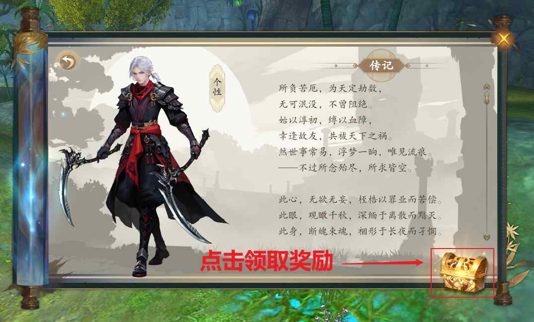 通过界面右下角的“完美英雄志”图标进入,找到“血灵·天狩”,点击进入。然后点击图片中的宝箱,就能领取奖励。