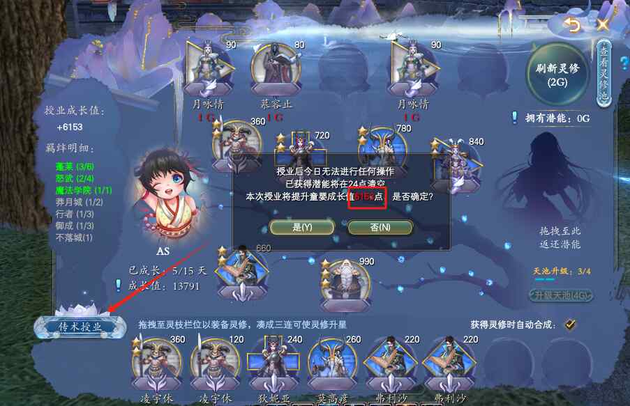 开启新的一天,我们可以看到小仙童拥有20G的潜能,以及一次免费刷新灵修的机会。后续每次刷新消耗2G潜能,购买灵修也需要花费相对应的潜能,也可以用潜能来购买天池经验,用于升级天池!天池等级越高,刷到高等级卡片的机率也越高!那是不是天池等级越高越好呢?每天就20G,怎么才够花呢?