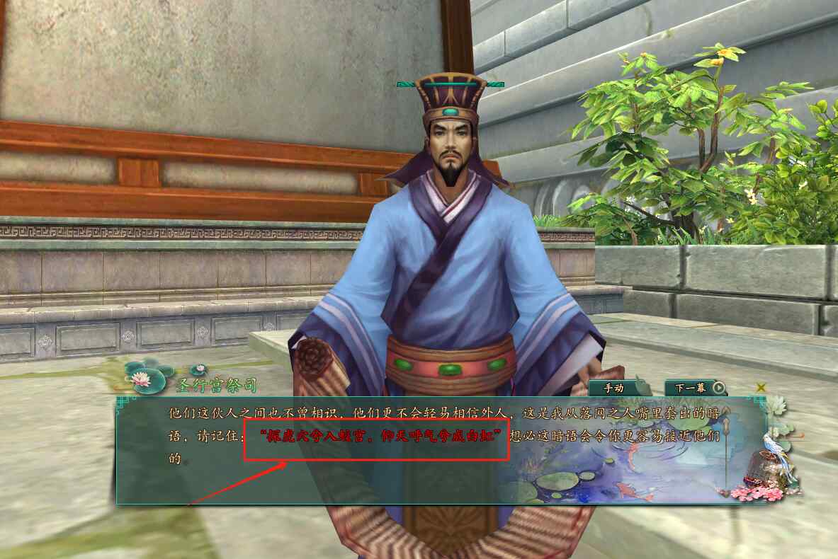 接任务的时候,NPC会给一句暗号,“探虎穴兮入蛟宫,仰天呼气兮成白虹” ,这个记着,后面任务有用的。