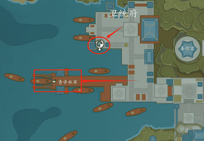 第三个:青帝水军附近。这个时候可以先传送到卫统府,然后到青帝水军的桥上,走到底就可以看到NPC,行迹可疑的青帝水军(100.405),点击NPC对话完成任务即可。