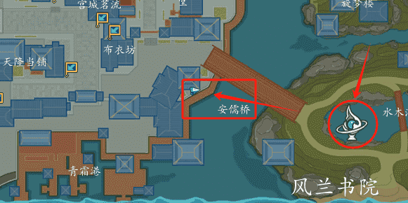 第四个:永安城的桥边,这个范围就比较大了,毕竟永安城有好几座桥。运气比较好,我在去青霜港的途中找到了桥边的NPC,行迹可疑的居民(191.313),传送到风兰书院,往青霜港飞的的途中,在安儒桥的桥头哦!对话完成后自动完成任务,就可以去找最后一个NPC了!