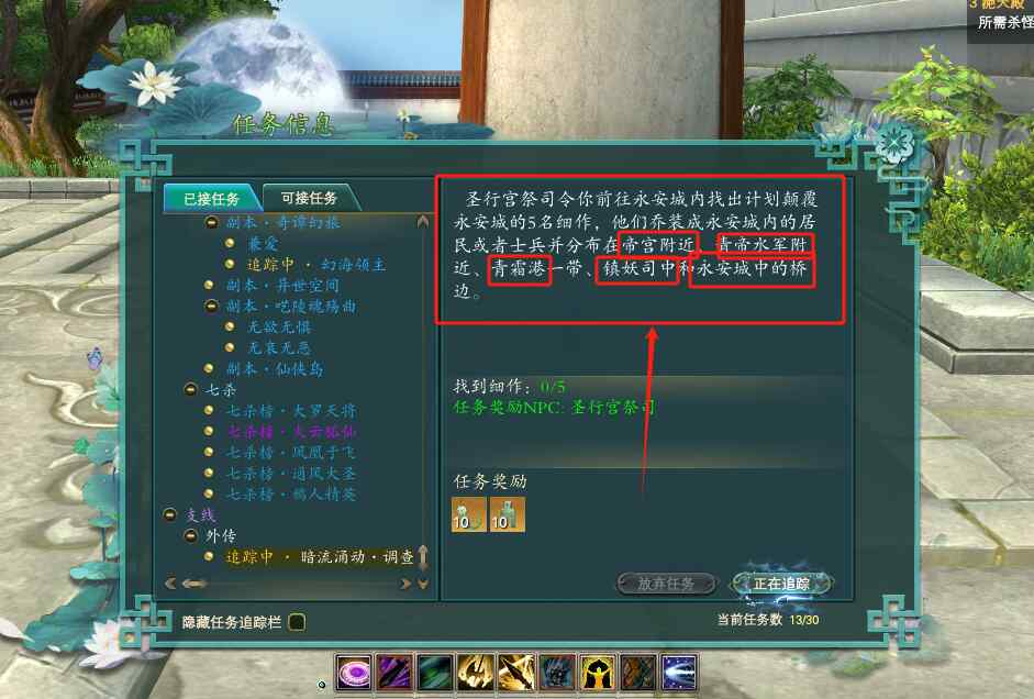 很多小伙伴觉得这个任务难在哪里呢? 就是没有给出5个细作的坐标,也不能直接追踪任务目标,所以找半天还是无头苍蝇一样找不到! 这里我们点开Q键,查看我们的任务详情,可以看到任务描述里面,给了我们需要找到的NPC的大致的区域,分别是:帝宫附近,青帝水军附近,青霜港一带,镇妖司中,以及永安城的桥边。跟着这个大方向去找,就能很快找到了!