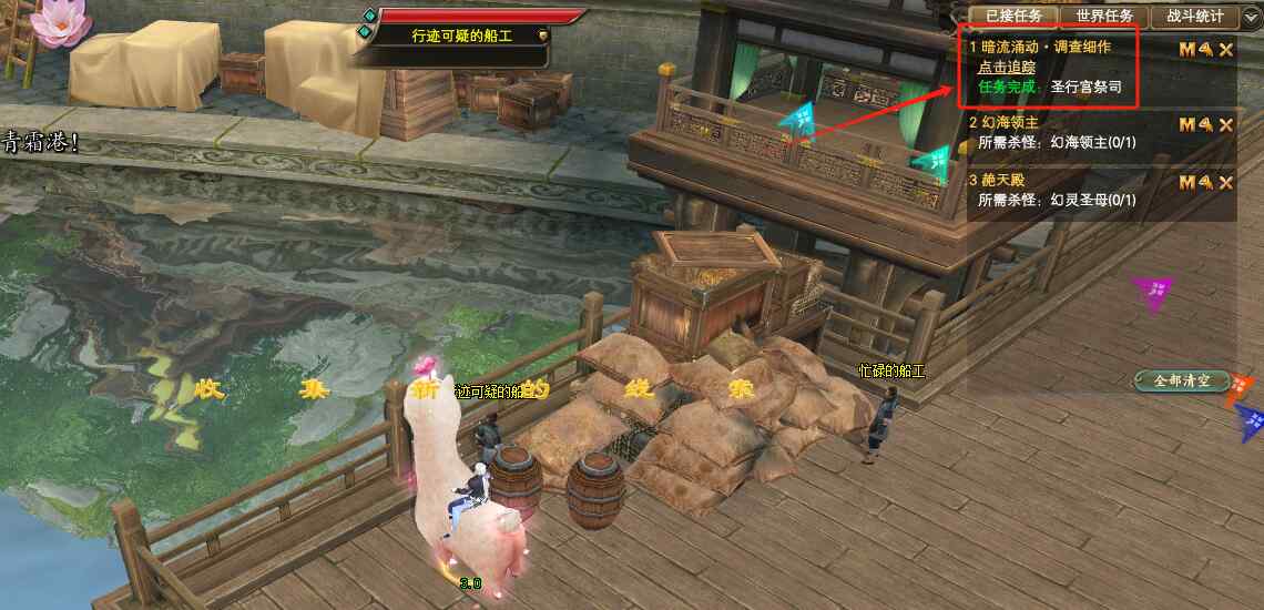 第五个:青霜港一带。在忙碌的船工附近,不仔细看就错过了!行迹可疑的船工(162.295)对话完成后,这个任务NPC就全部找完了哦!可以去圣行宫祭司那里交任务了!