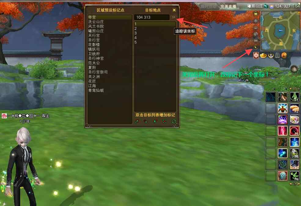 ②依次输入曦照山庄20个宝箱坐标,点“追踪该坐标”并输入名字按顺序1-20标记,输完建议核对一遍无误再去找宝箱;