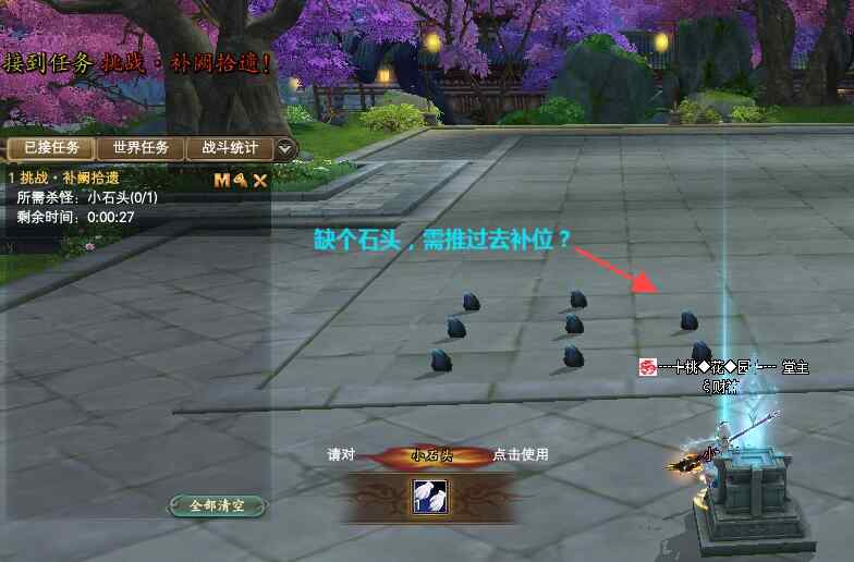 10.挑战.补缺拾遗、或补阙拾遗,又叫推石头:限时判断哪个位置空缺小石头,直接用手套把小石头推过去补位即可挑战成功,再挖宝箱。
