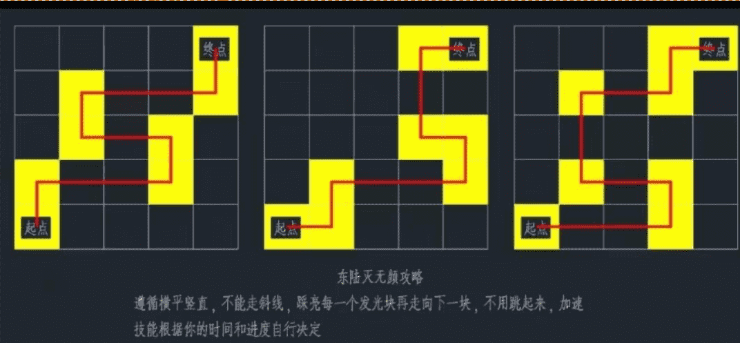 12.挑战.灭无颜:对装备有要求,自身装备模式,建议417+打手,满状态3万血,带红F。战斗中,需走两次方块,共计三种方格形式如下图,遵循横平竖直、不可走斜线,踩亮发光后去下一块方格,不用跳起来,可技能加速、精灵神行加速,总之一条线把所有方格串起来,熟悉了很简单。若挑战成功,返回原点挖金銮宝箱,需击杀灭无颜七次、共计7个金銮宝箱。