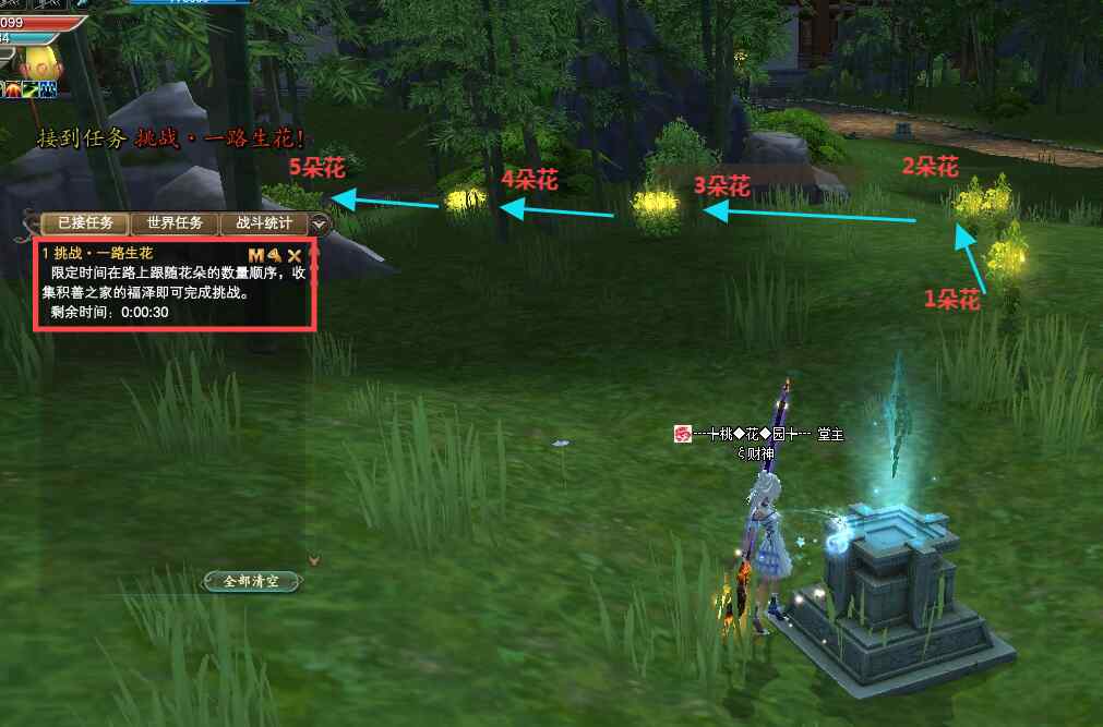 6.挑战.一路生花:限时按12345顺序靠近花朵数量,获得福泽后挑战成功,直接挖宝箱。