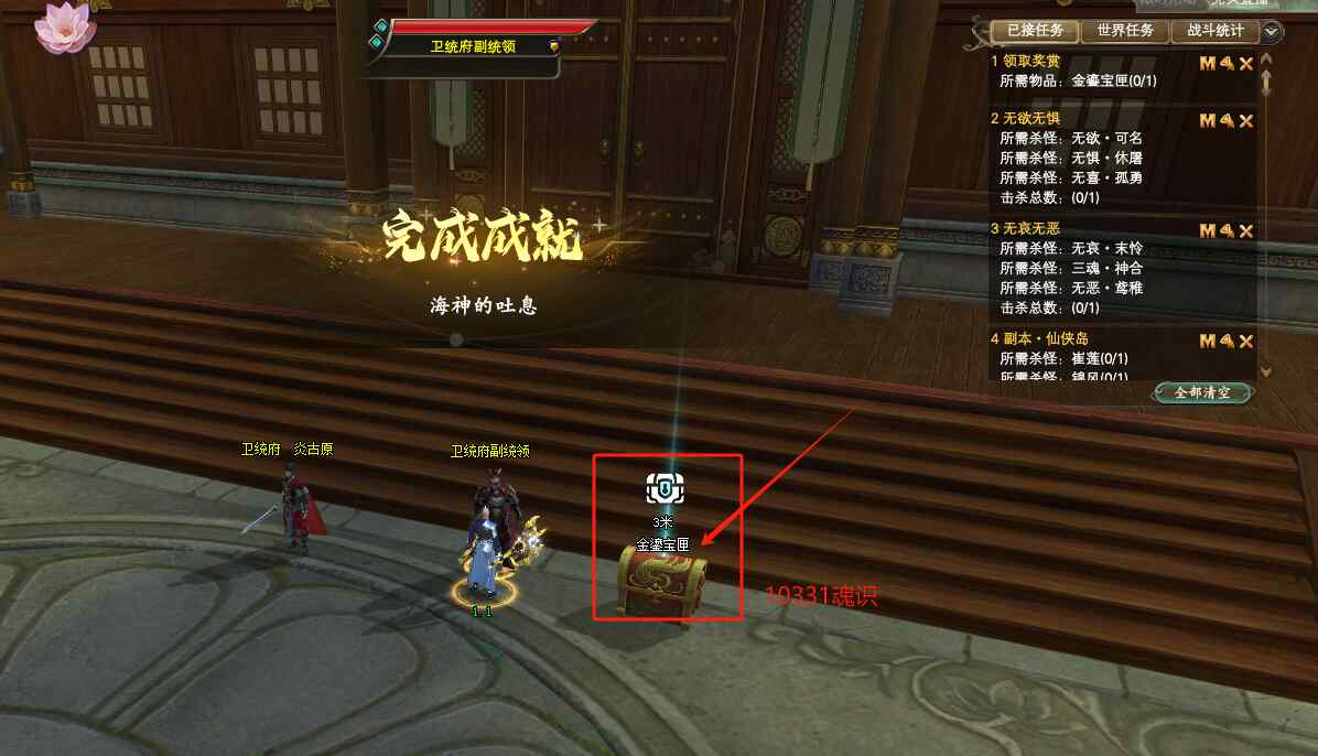 传送返回卫统府,(132.423)副统领处交任务!完成成就:海神的吐息,奖励五个天行宫馈印。奖励金鎏宝匣:10331魂识,20个天行宫馈印。飓风之患任务,全部完成!小伙伴们,快点一起来挖宝箱了!东路任务毕业,指日可待!~~