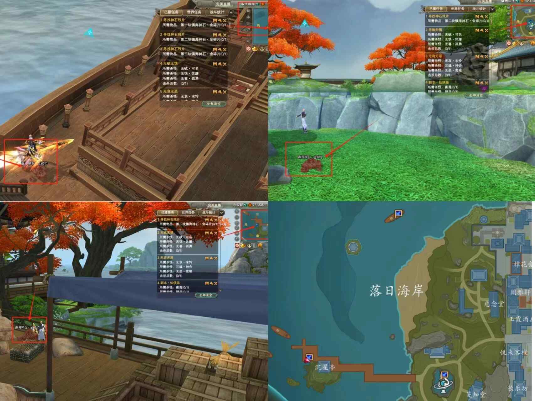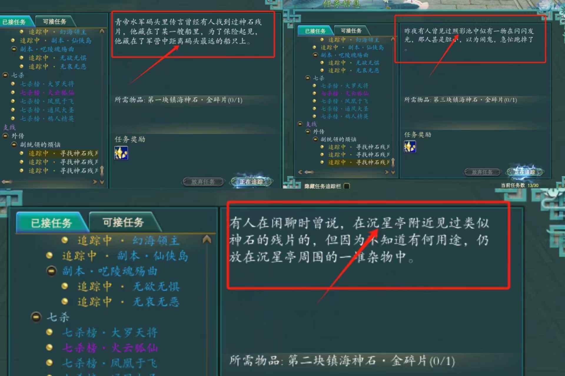 传送到卫统府(132.423)副统领接任务哦 !对话完成后,接到寻找神石残片任务。没有追踪坐标,也没有黄圈追踪提示。那么我们怎么知道这三个神石残片在哪里呢?! 打开我们Q任务栏,已接任务的详情介绍里面,告知了三个残片分别位于青帝水军最远的一艘船(108.385),沉星亭(76.335),照影池(123.329)水下哦。