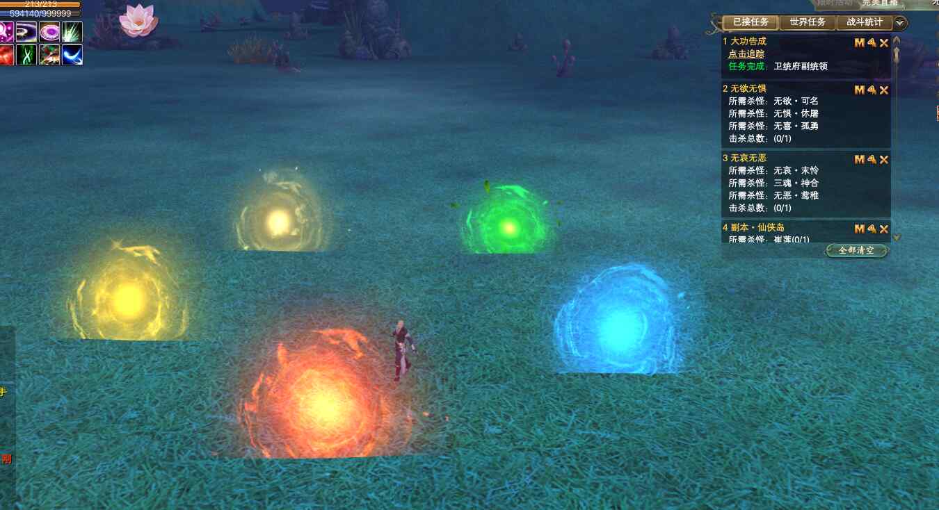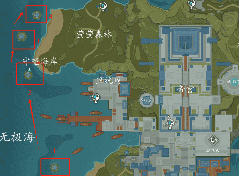 依次点亮后,返回卫统府,找水师校尉(130.425)交任务。接到任务,去无极海(74.409.高度50)放入镇海神石·金,地图有追踪黄圈哦!到了黄圈中央,跳下水即可。放置好金以后,旁边依次出现土、木、水、火、都放置好后完成任务。