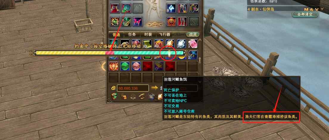 羽落河鲫:原地打开包裹,使用包里的羽落河鲫鱼饵,等白色光标移动到红色区域时,按下空格键。就会得到羽落河鲫。如果按到了黄色和蓝色区域,会钓到小虾米,不要着急,会返还给你鱼饵,继续钓就可以了。多练习几次就能轻松点到红色区域了!