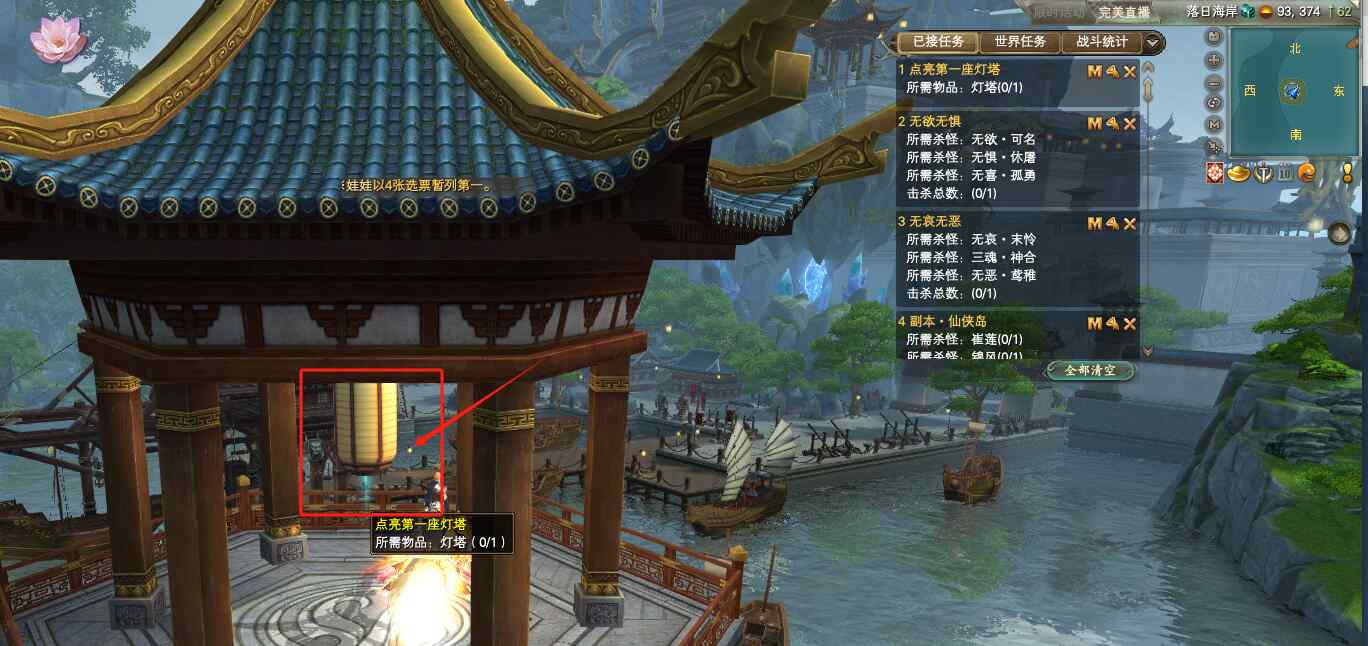 点亮第一座灯塔,飞起来到塔顶(93.374.高度62)挖中间灯笼点亮。然后往北飞,去第二座灯塔(76.432高度62),第三座灯塔(72.457.高度62),第四座灯塔(81.470.高度62)。