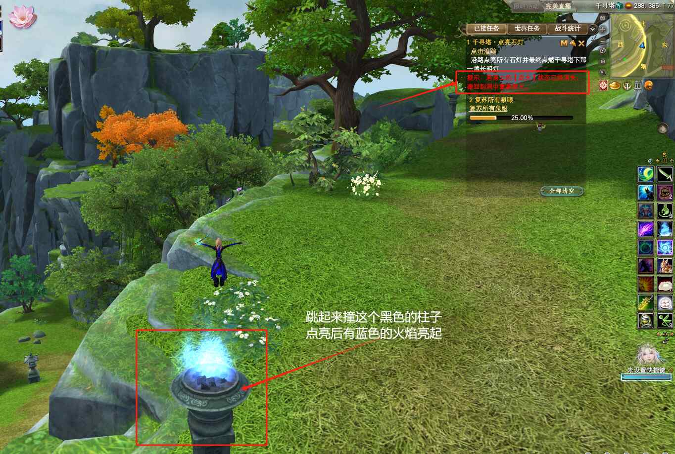 进入东路以后,可以通过地图(M键)上的“炁”,传送到千寻塔,到一朵小花(263.383)接任务哦!接完任务后,会像醉酒状态一样的乱动视角,根据提示,到塔下面的入口(263.390.高度94)完成任务。自动接到守山人任务,根据追踪黄圈去找守山人丰憬(251.364.高度63),(飞起来以后,醉酒状态就会消失)对话丰憬,接到长明灯任务,也是有追踪黄圈的哦!我们通过炁传送到凝玉台,然后飞到花影楼(198.366.高度71)挖半空中蓝色的光球。注意:要打开光效哦,不然可能看不到蓝色光球!