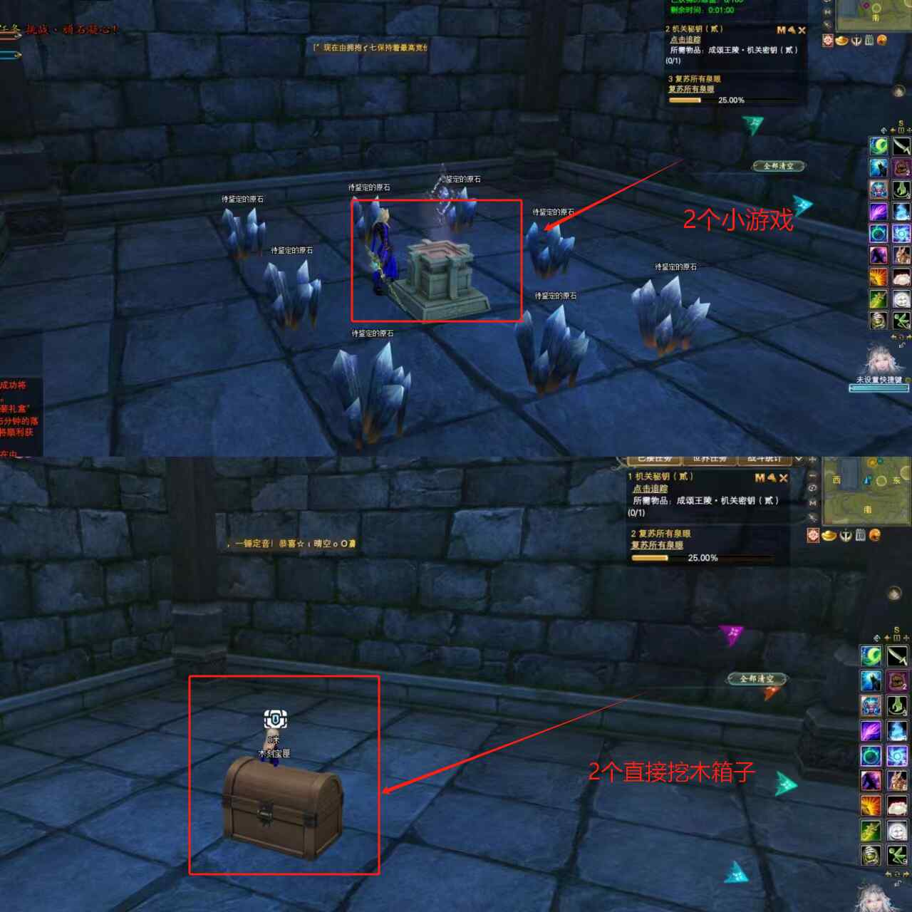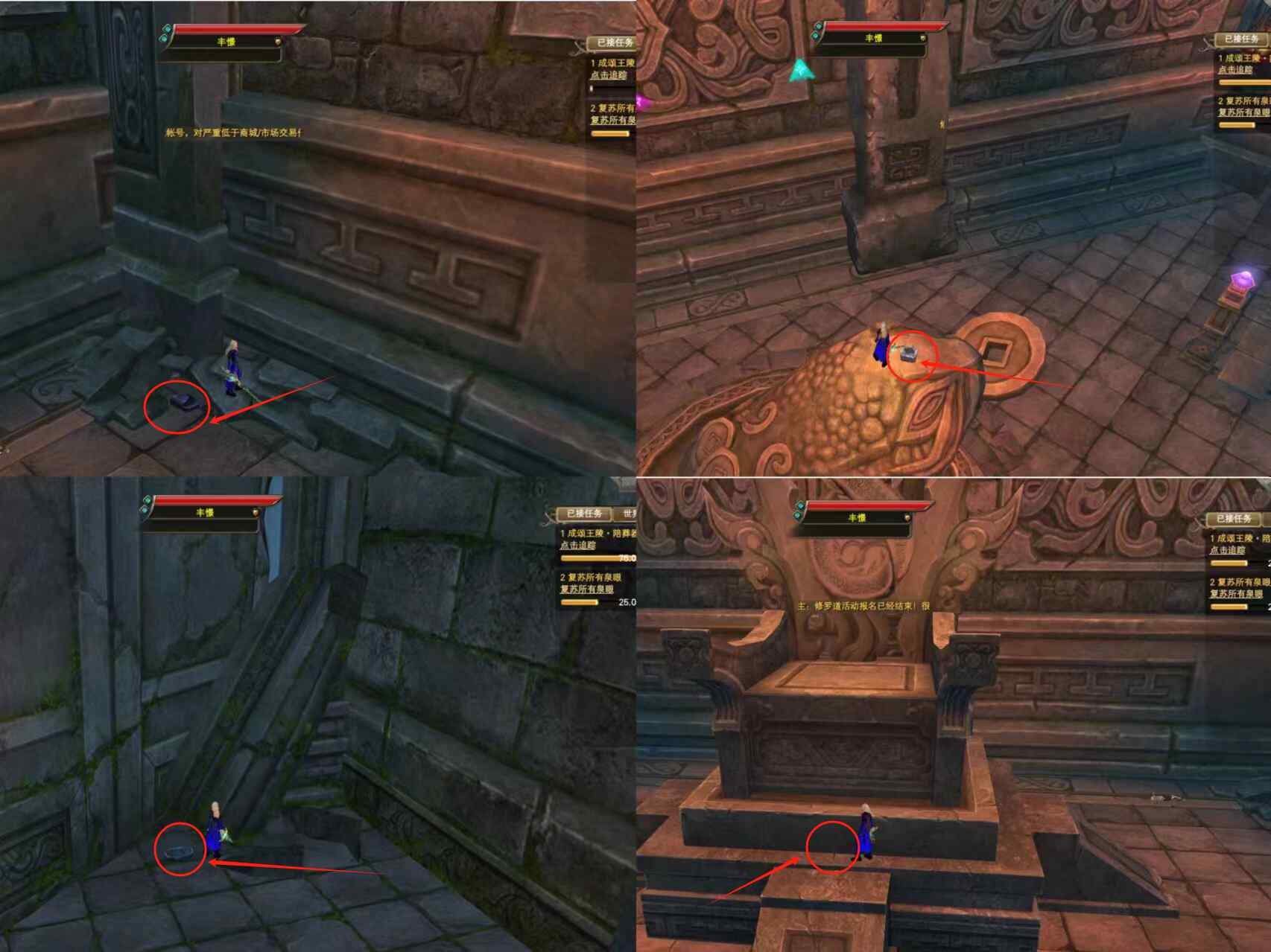 终点是塔下那个矮矮的石墩(363.389),点燃后会出现一个NPC-赛慕,和赛慕对话完成后,进入塔内,继续对话赛慕,然后挖取机关,就是地上的钥匙图案(263.391),挖完后继续对话赛慕,接到任务,去挖剩下的三把钥匙。地图上都是给出了追踪黄圈的,小可爱们去相应的位置寻找即可!