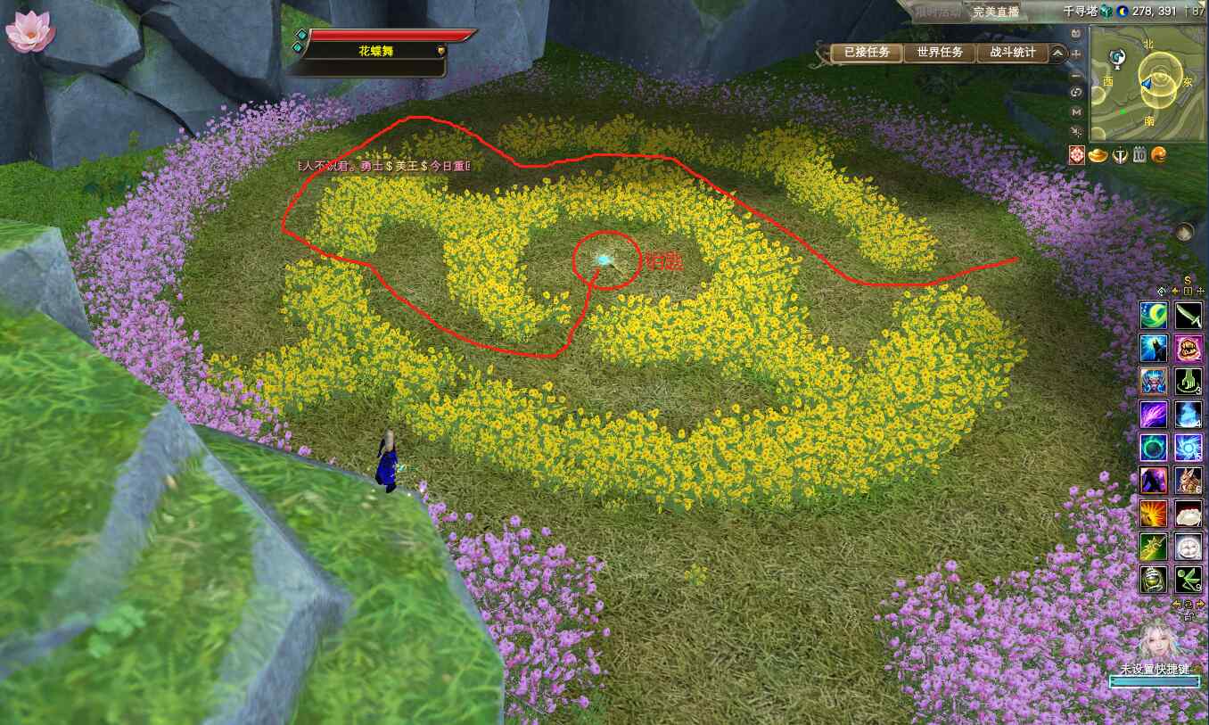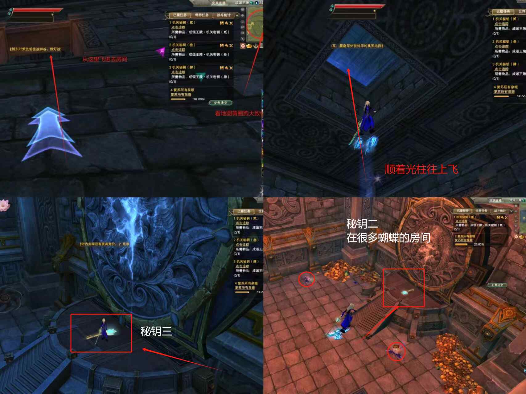 第二把钥匙,到花蝶舞(280.389.高度86)接任务,对话后,需要到花丛里面取出钥匙,不能踩到任何一朵花,否则失败重来。注意:这里是禁止飞行状态哦,然后需要把花草特效调到最高哦,不然看不到路!