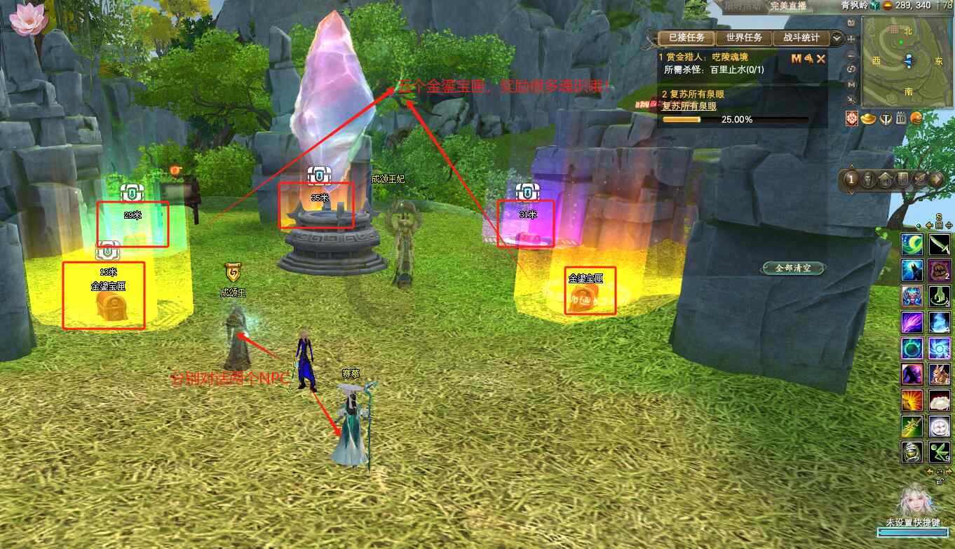 都挖完以后,回到千寻塔找赛慕(263.388)交任务。进入塔内后,继续对话赛慕,挖取面前的机关,弹出剧情动画,完成后回到塔外,对话新出现的NPC丰憬(263.389),接到任务净世琉璃,去(255.374.高度71)找水之宝珠,在瀑布的后面哦!撞击蓝色的光球,然后身上会有一个60秒的“仁”状态,这个时候赶紧加速飞行,去塔顶挖净世琉璃!如果觉得自己飞行时间来不及,就用地图传送回千寻塔。飞上塔顶挖水晶下面的石墩,鼠标多移动几次就能找到了!