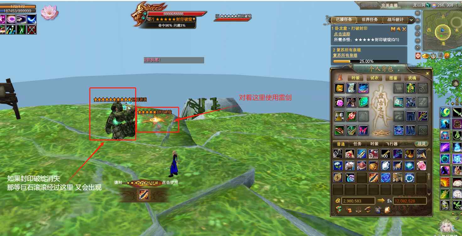 很多小可爱说这里打碎了石头,也进不去山洞,最简单的办法是,点击山洞里的黑板,使用技能如夜影无情游,剑灵御心剑,进入山洞,或者找一个MO、WX把你推进去。出去就很简单了,挖完结晶以后,通过地图上的“炁”传送回卧龙窟。 使用包里的元素结晶,把雷剑升级到5星,回到山顶(266.307)找到封印破绽,使用包里的5星雷剑,打碎封印。注意:封印破绽出现一会儿会消失,如果到达坐标没有,等待一会儿就会出现了!获得成就:“硄!”奖励5个天行宫馈印。