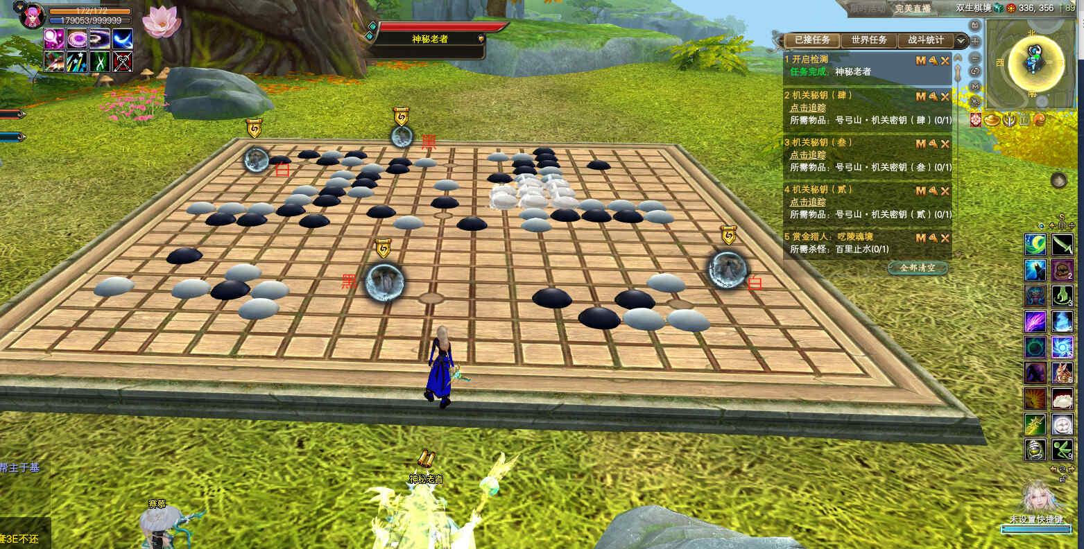 和赛慕对话后,传送到号弓山,往南飞,到(339.346.高度83)自动触发收集秘钥任务!返回号弓山,到神秘老者(335.356)领取任务,寻找丢失的白子。根据追踪黄圈,往南飞,到(345.339.高度97)挖取棋子,再返回神秘老者这里交任务!交完任务后获得机关密匙一。继续对话神秘老者,接到任务放置黑白棋,这里比较简单可以试出来答案。4个位置都放正确了以后,找神秘老者交任务,获得机关密匙二。