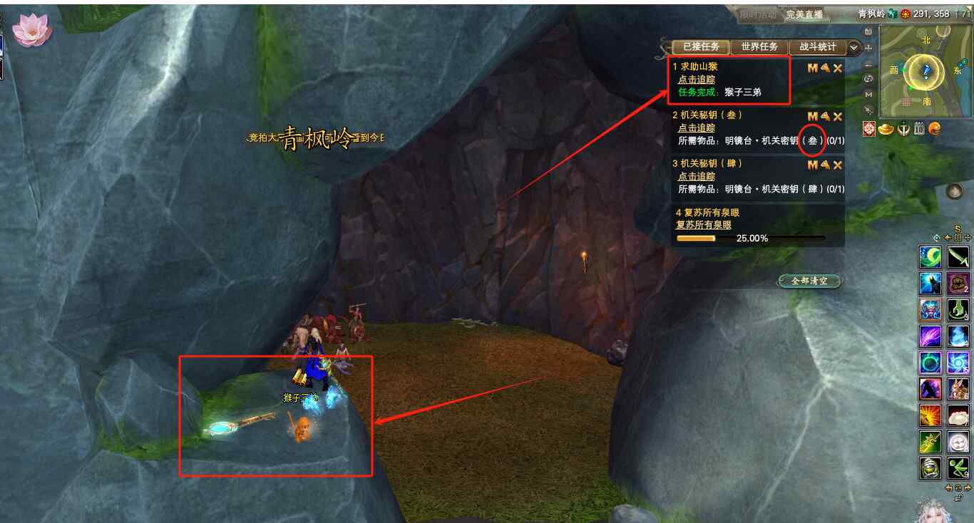 跳下瀑布,前往(301.360)对话小猴子,这时猴子开始边跑边出分身了,一直到出3只分身,我们跟着中间的一只到达(305.381),看到猴子大哥头上的灰色任务卷轴标志变亮,就去找猴子大哥交任务,如果任务没成功,说明我们跟的猴子是假的,这个时候再去找旁边的猴子,挨着猴子停留2秒,等猴子大哥头上卷轴变亮,就去交任务,直到找到真的猴子为止。注意:这里限时2分钟,如果两分钟没有完成任务,那任务失败,传送回悬崖钥匙处重新开始!(注意:这里很容易因为超过2分钟时间失败!小可爱们可以使用神行或者盗骊丹加速!)