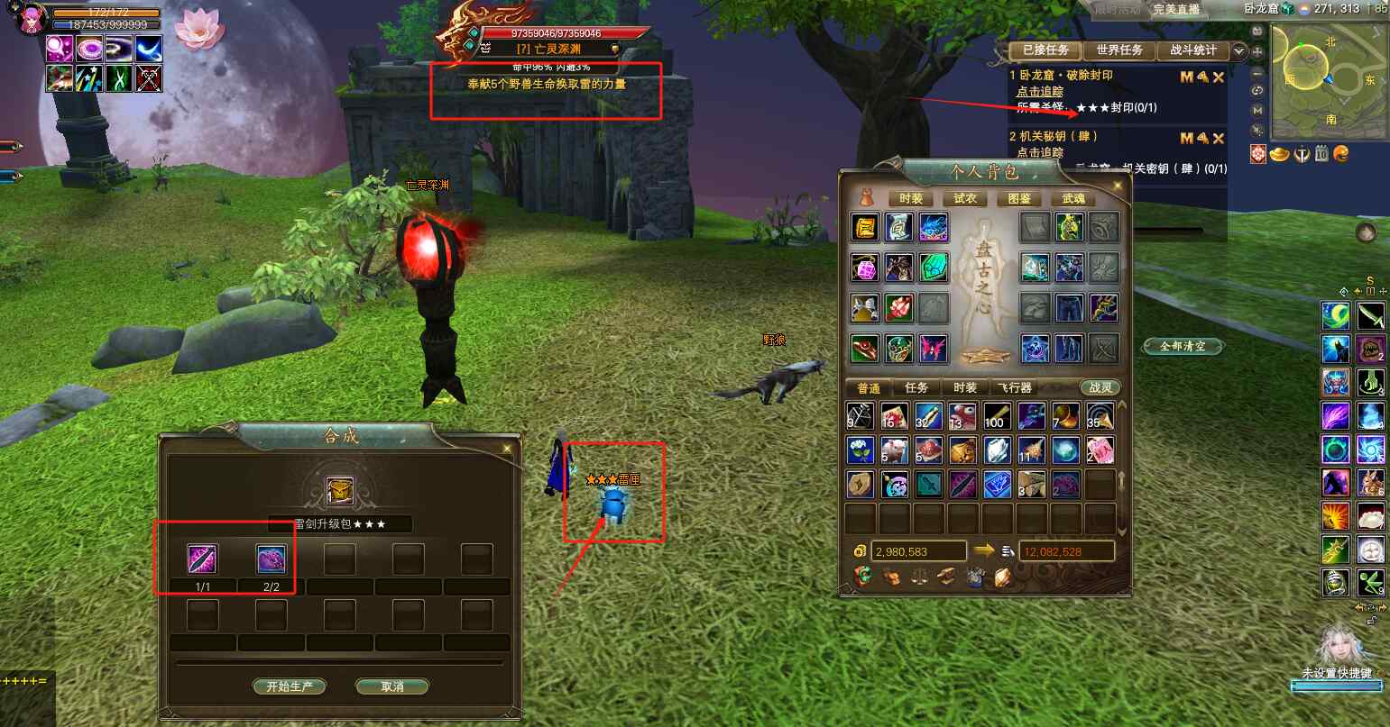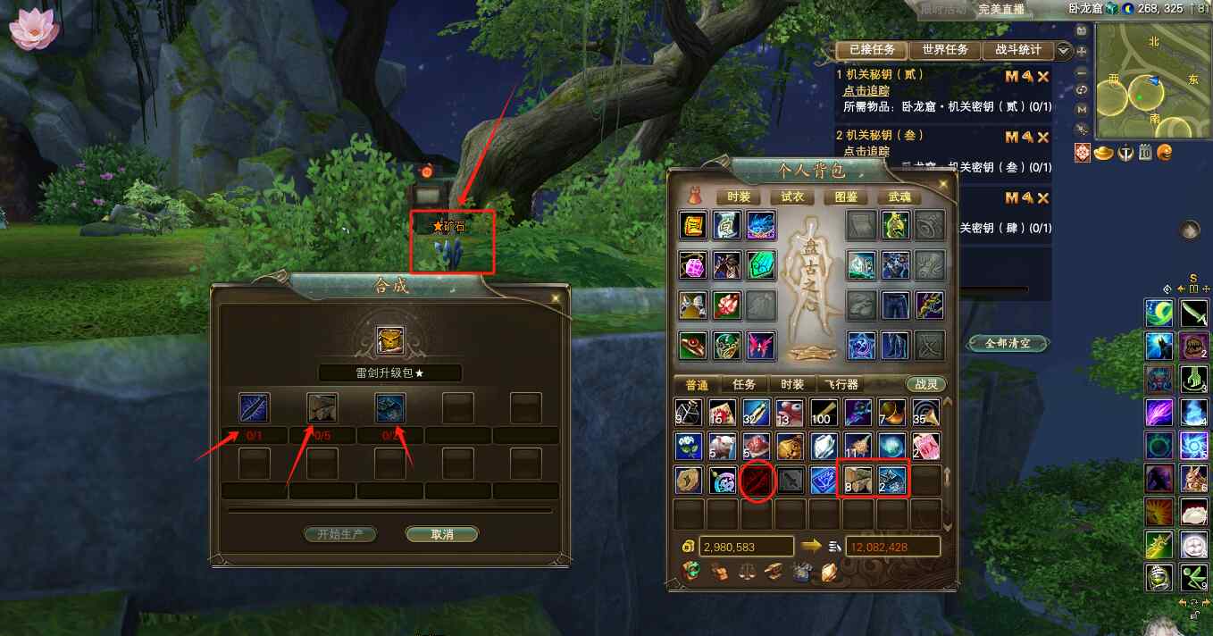 机关秘钥二,打地上的木头,会掉落木材,捡起来有用!然后到(267.324.高度81)打矿石,掉落矿石。都需要用包里的雷剑打哦!打够5个木材和2个矿石,就可以打开背包,放入材料,升级我们的雷剑了!升级成2星雷剑以后,到(266.323.高度81)挖取第二把秘钥。