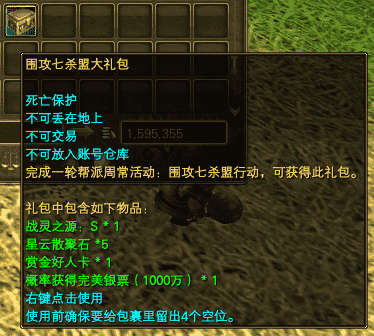 如图所示,完成一轮任务,可以获得如下大礼包。必得“战灵之源S”,5个星云散聚石和1个价值100万金币的赏金好人卡。战灵之源S有几率开出S卡。1000万的银票有概率获得。
