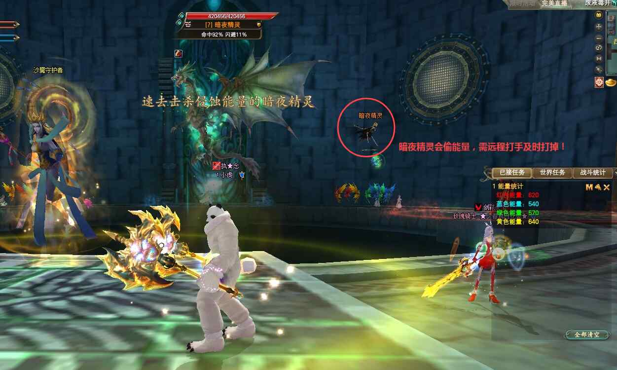③战斗中远程打手需及时打掉空中缓慢移动的暗夜精灵,暗夜精灵若接近守护者会降低对应颜色能量40点;