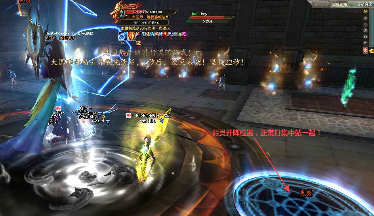 ①站位,所有玩家集中站BOSS正北方一侧,羽灵直接开蓝阵,大国师90%血量推人后羽灵重开蓝阵;
